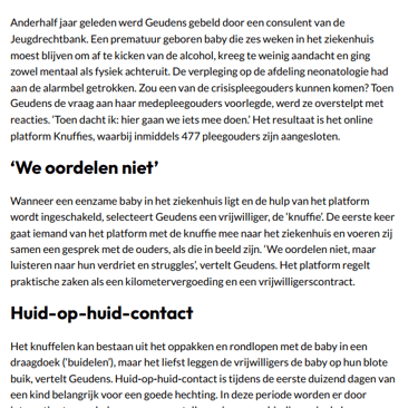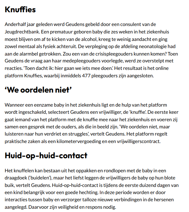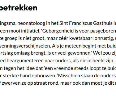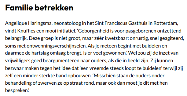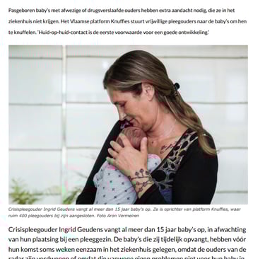 Intussen wordt ze dagelijks herinnerd aan het belang van nabijheid van lichaamswarmte en hartslag voor deze premature en zieke baby's. "Als ik een baby heb opgehaald uit het ziekenhuis, zit hij in de vechtmodus óf hij heeft alle vertrouwen verloren, huilt niet en geeft geen signalen meer. Als hij dan stilaan weer oogcontact gaat maken en huilt om een flesje, denk ik: zalig, wéér een verbinding in dat hoofdje erbij. Bij elk contactmoment spring ik een gat in de lucht."