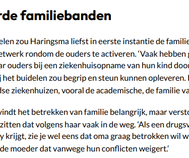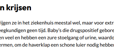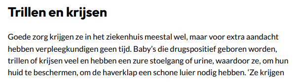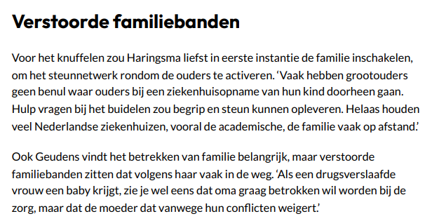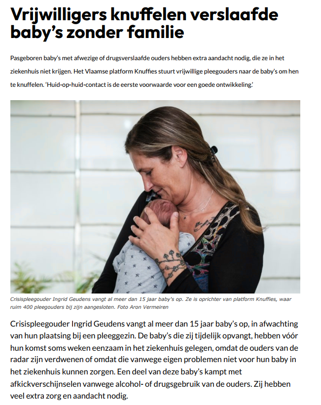 morfine om het afkicken draaglijker te maken, maar door hun ontwenningsverscjhijnselen zijn ze onrustig en geagiteerd', vertelt Geudens. Eens haalde ze een baby in het ziekenhuis op van wie de drugsverslaafde moeder een hersenbloeding had gehad. De vader was uit beeld. "Die baby was door zijn afkickverschijnselen zo overgevoelig dat aaien pijn deed."